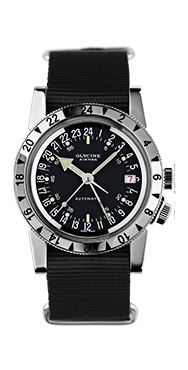 | Airman 1953 Vintage. This model celebrates the 1953 original. It's a limited edition and comes with a period wooden case and 1950s style guarantee certificate. Polished and satin stainless steel case. Automatic. Screw down crown. Sapphire crystal with date magnifier. Glass back. Silder dial. Nickel hands with old brown superluminova. Water resoistant to 200m. D= 42mm. H= 11.8mm. Standard GMT version has 4 hands and 3 time zones. The purist's version has 3 hands and two time zones each in 24 hour format (shown right). Strap of high tech. fabric. Base movement: ETA 2893-2.