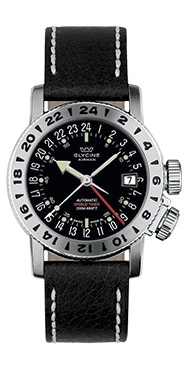 | Airman No. 1 - New. This is a retro model reminiscent of the 1950s when the Airman range began. Automatic with 3 time zones. Stainless steel case, polished. Luminous. Date. Plexi glass crystal. Solid back. Water resistant to 100m. D= 36mm. H= 10.75mm. Basre movement GL293. There is only one 3 zone execution (3944) but a purist's version (all 24 hours but 2 zones only) is available.