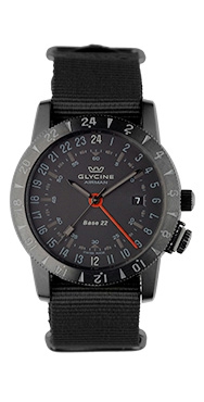| Airman Base 22 "MYSTERY". This is a new and unusual model. It is also a best seller. Polished stainless steel case with black PVD coating. Automatic. Sapphire crystal. Glass back. Dial black with superluminova. Hands black with black superluminova. Red GMT hand. Screw down crown. 3 time zones and 4 hands (GMT version). Purist'sversion available with 3 hands and 2 time zones in 24 hour format. Water resistant to 200m. D= 42mm. H= 10.9mm. High tech. fabric strap. Base movement: ETA 2893-2.