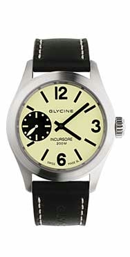 | In the "Incursore" series, the much loved hand winding 3804 models have been discontinued in favour of the new 3873 series which incorporates some improvements.These watches are very attractive and embody the essence of Glycine - bold large watches which are easy to read. Shown here is 3873.15-LB9 which has a light yellow dial. Other versions are available with black dials. Manual winding; brushed stainless steel case; sapphire crystal; glass back; water resistant to 200m. D= 46mm. H= 12mm. Base movement: Unitas 6497. Strap versions £1020 Bracelet versions £1120